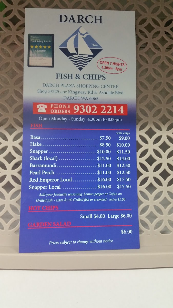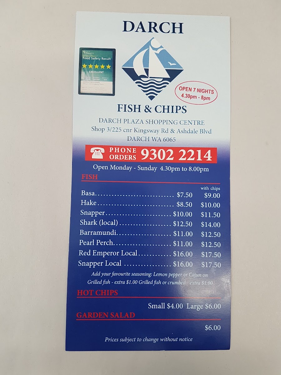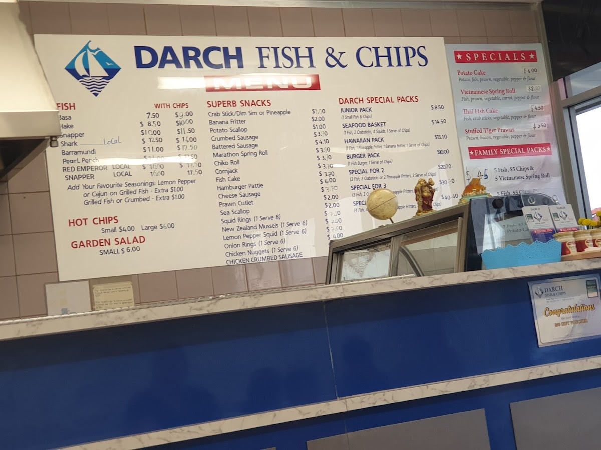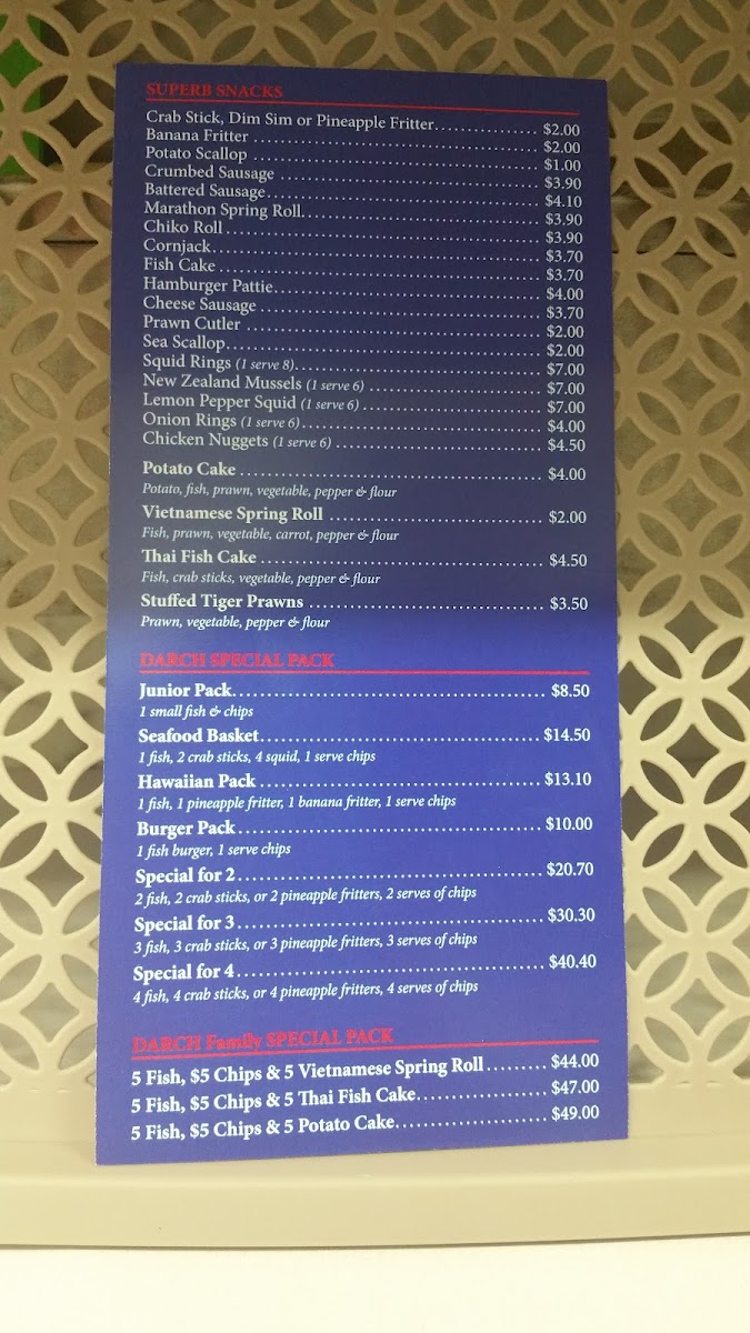 From a reviewer’s perspective, the menu at Darch Fish & Chips offers a satisfying mix of classic takeaway staples and customizable seafood options, making it easy to cater to different tastes. The SUPERB SNACKS range, including Crab Stick, Dim Sim, Pineapple Fritter, Banana Fritter, and Potato Scallop, provides affordable add-ons that pair well with the main meals. The FISH selection stands out with choices like Basa, Hake (New Zealand), Snapper, Barramundi (Local), and Pearl Perch, all of which can be prepared in various styles such as crumbed or grilled with options like Lemon Pepper Seasoning or Cajun Seasoning. Value-driven deals like the DARCH SPECIAL PACK (including Junior Pack, Seafood Basket, Hawaiian Pack, Burger Pack, and Special for 2) and the DARCH FAMILY SPECIAL PACK-notably combinations like 5 Fish, $5 Chips & 5 Vietnamese Spring Roll, 5 Fish, $5 Chips & 5 Thai Fish Cake, and 5 Fish, $5 Chips & 5 Potato Cake-offer generous portions at appealing prices. The HOT CHIPS in Small and Large sizes, alongside sides like GARDEN SALAD, round out the menu, while extras such as Small Tub Tartare Sauce, Large Tub Tartare Sauce, Jar of Tartare Sauce, and Gravy Tub add flexibility. Overall, the menu balances variety, value, and customization, making it a dependable choice for both quick bites and family meals.